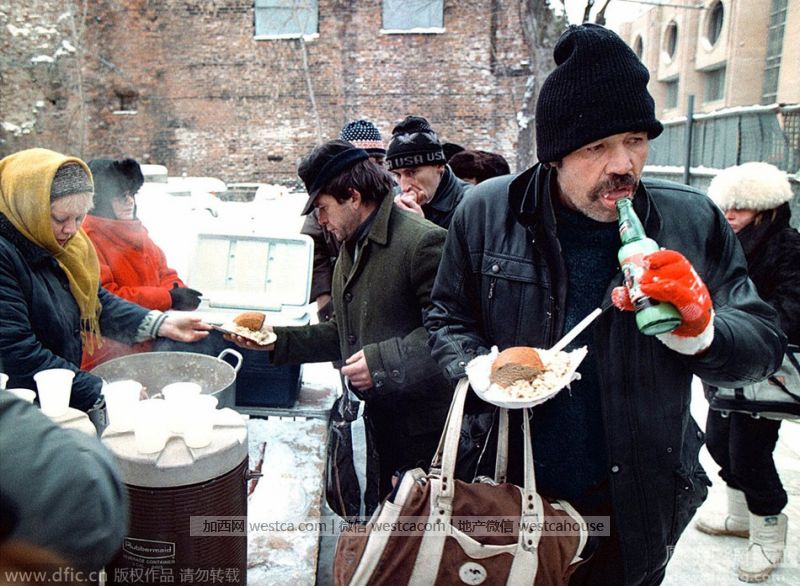 当地时间1999年1月13日,俄罗斯莫斯科,无家可归的流浪汉正在救助点排队领取免费食物。