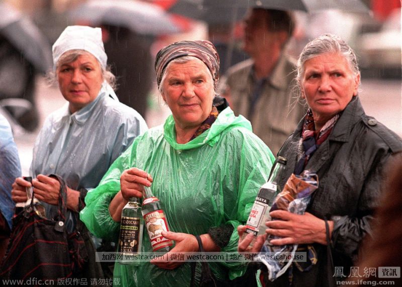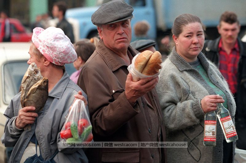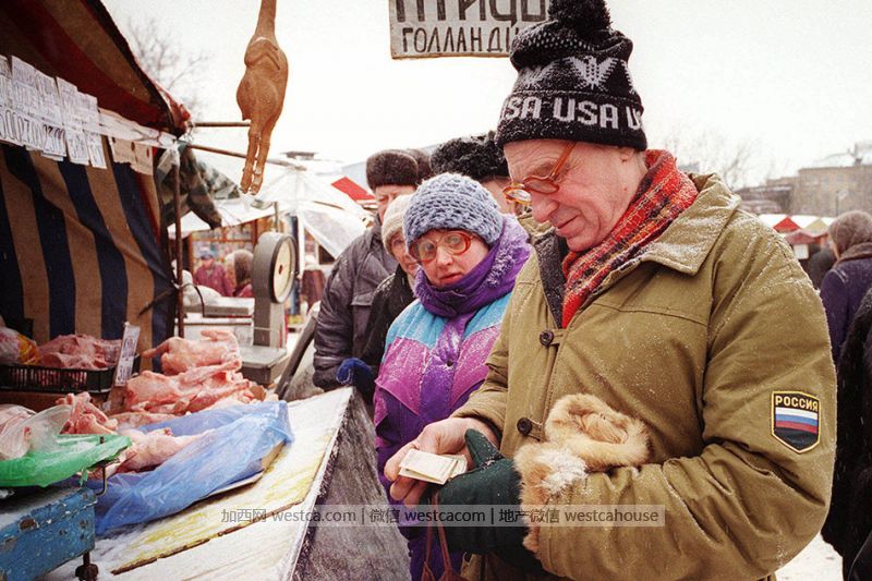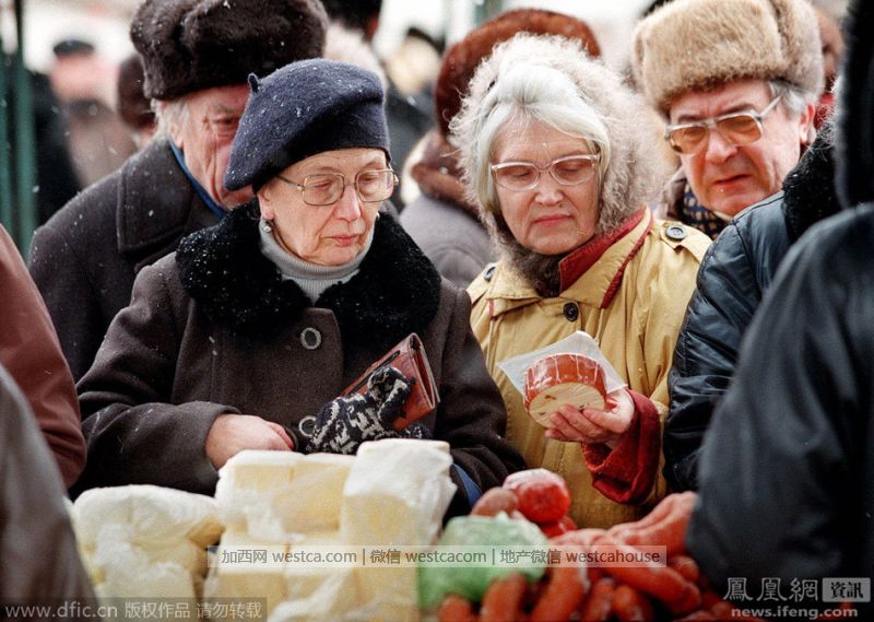 1999年2月9日,俄罗斯莫斯科,许多老年人正在集市上排队购买低价食品。