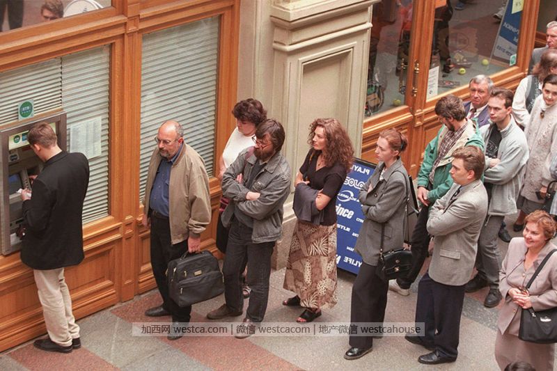 1998年8月,银行自动柜员机前排起的长队。