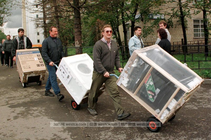 1998年8月,莫斯科人从商店里买回日常家电和电器。