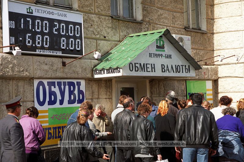 1998年9月,莫斯科一处换汇点前排起的长队。
