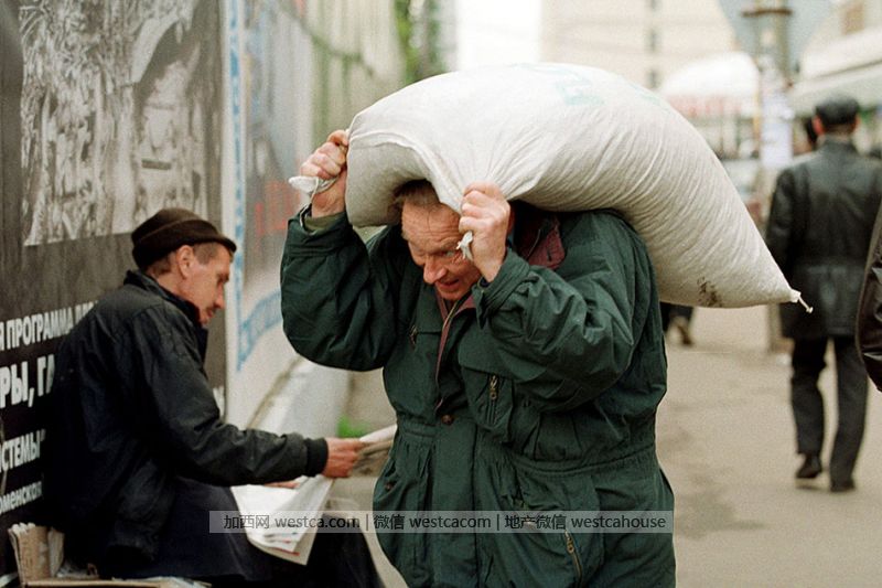 1998年9月,莫斯科居民扛着一袋面粉走在市中心的街道上。