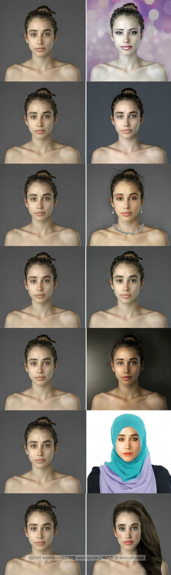 霍尼格通过国际自由职业者网站,将自己的照片发送给一些不同国家的PS爱好者,让他们根据各国审美标准对其照片进行修饰。结果她发现,来自不同国家的照片只有很少的相似之处。