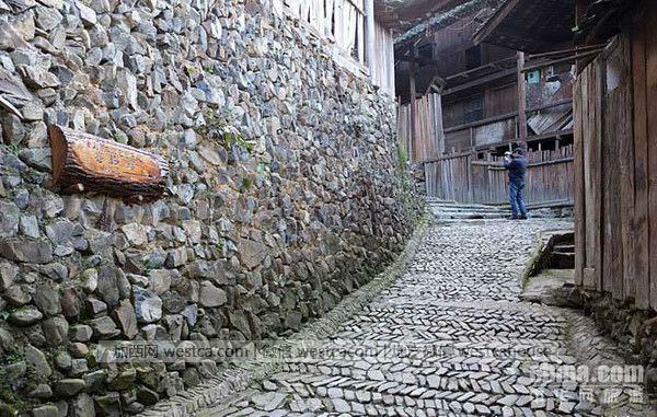 傍晚前光线正美,走进寨里,寂静无声。或许白日里游客多些,也有“芦笙舞”的演出,但我却向来喜欢幽静,恰如此时此地,唯有默默无言,向前走着,停下看看。吊脚木楼,鳞次栉比,错落有致。寨中道路、院坝及各户门庭,都用鹅卵石或青石镶砌铺就。寨中有两个铜鼓、芦笙场。场子模仿古代铜鼓面太阳纹的图案,以青褐色鹅卵石和料石铺砌成十二道光芒,朝着十二个方向伸展。