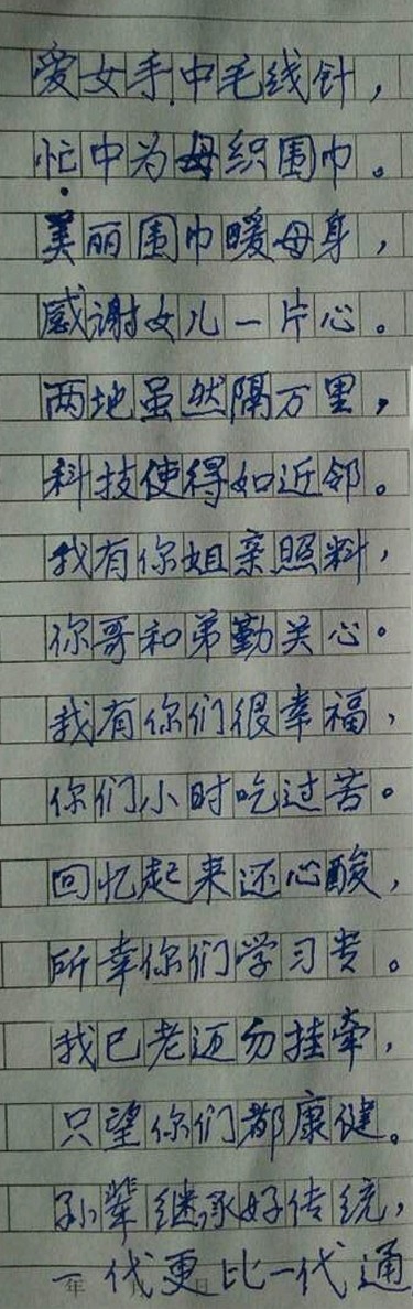 老岳母早年毕业于南京中央大学,是共和国第一代高级工程师,现已90岁高龄。夫人一针一线,赶织了一件长长的毛围巾,托留学生带回国内。老妈披上长围巾,一笔一笔写下慈爱洋溢的自由诗,通过网络传来影印件。全诗如下: