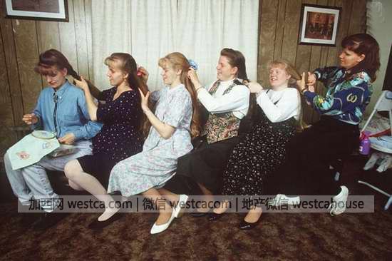 在遭受主流社会诟病和打压后,20世纪二三十年代,摩门教领导层摒弃一夫多妻传统,试图融入美国主流社会。而一小部分拒绝改变的多妻制家庭迁居至犹他州与亚利桑那州边界,建立实行一夫多妻制的部落。图为2001年5月4日,美国犹他州盐湖城,摩门教徒汤姆·格林的6个妻子为彼此梳头。