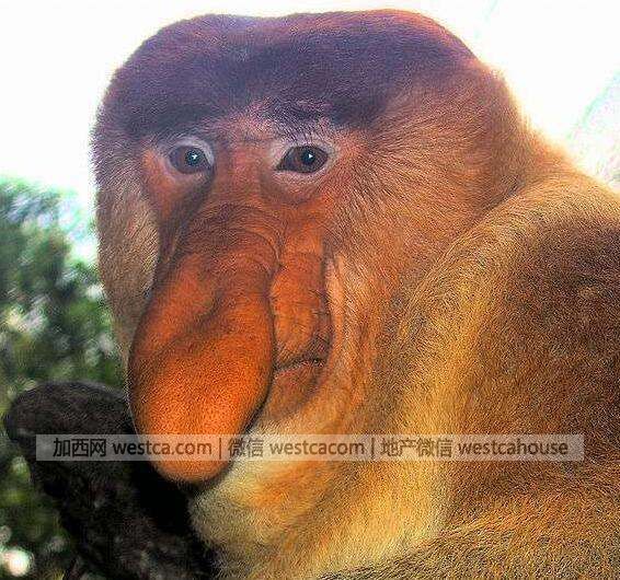 10. 长鼻猴。这种猴子主要产于婆罗洲岸边的红树林丶沼泽及河畔的森林,又大又长的鼻子非常显眼。