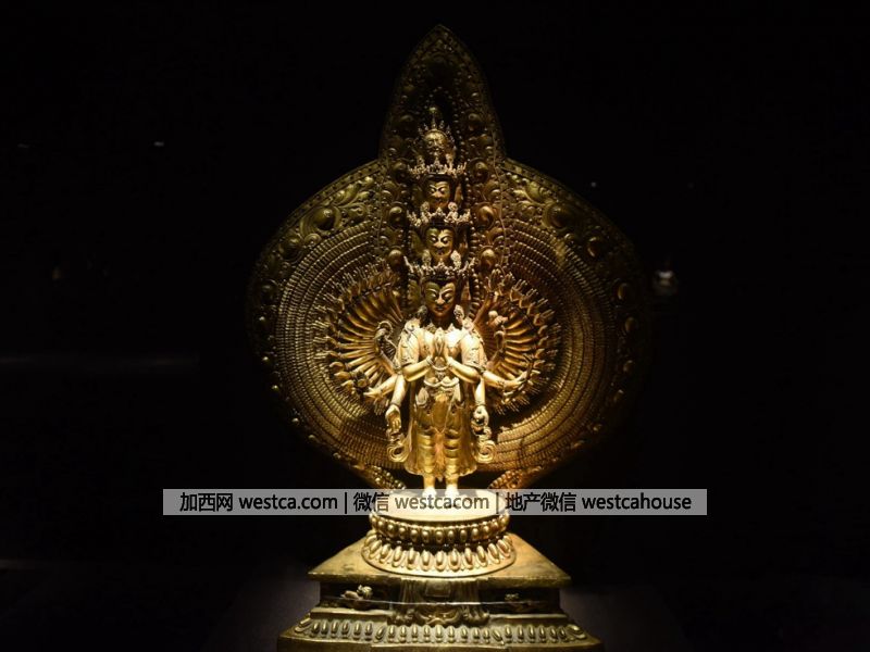 两汉时,佛教传入中国,佛像也随之传入。中国的佛像艺术在吸收印度佛教艺术的基础上,经过艺术家和民间工匠的再融合、再创造,形成了具有中国特色的艺术门类。图为17-18世纪的铜鎏金千手千眼观音菩萨。