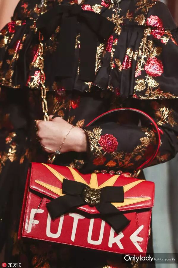 小號Sylvie的升級版讓四四方方的挺闊包包更帶有叛逆少年的“輕狂”,奔放的大紅色配上黃色的發散式圖案,帶有少女感的大蝴蝶結被一只霸氣的金色虎頭“鎮壓”著,少女氣質中不失個性詮釋;白色塗鴉的“Future”字母讓青春和未來聯想到一起。等著看吧,接下來背上Gucci包包的陣容裡又多了一票90後的新生力量!