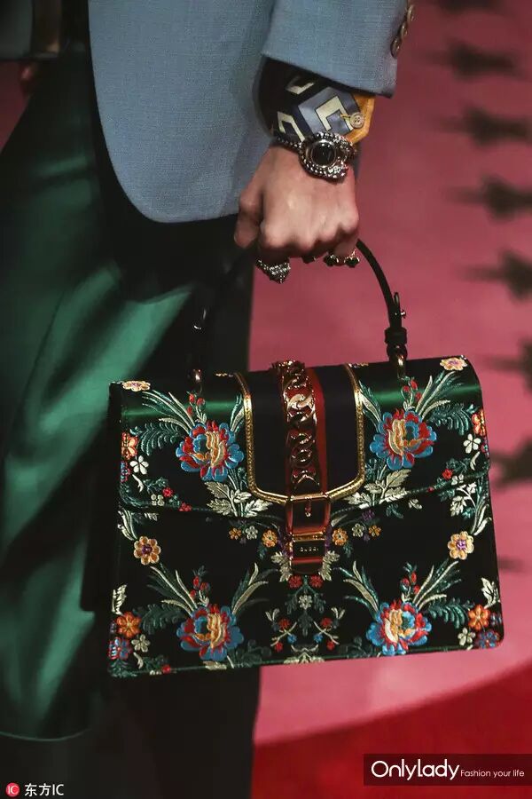 這一季的Sylvie手袋也將刺繡緞面花紋寫滿包身(也不奇怪),看來Alexssandro是想讓所有的包款都要“繡”一遍。所以如果你癡迷Gucci的刺繡,又鍾情Sylvie的款式,現在都可以滿足你了!