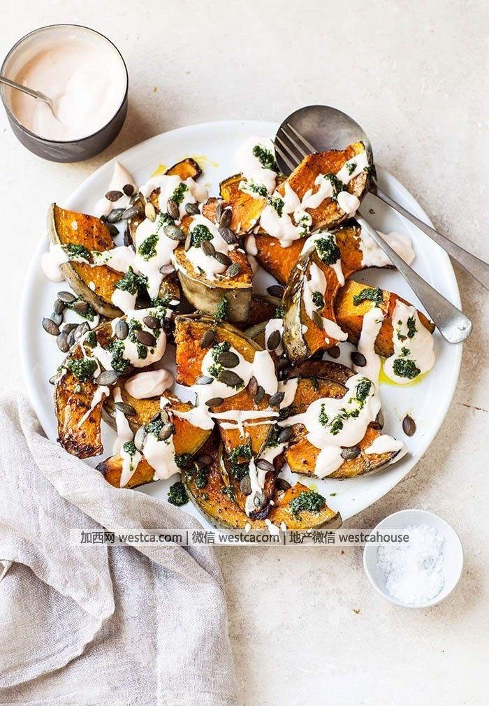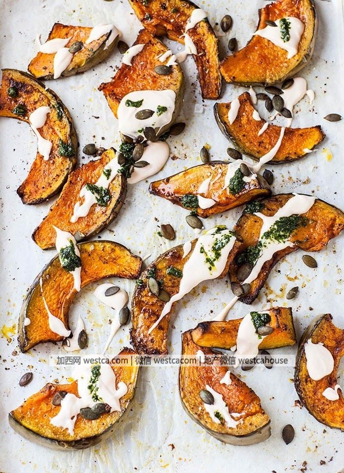 ④ 将香菜酱和酸奶辣酱撒到烤好的南瓜片上即可。