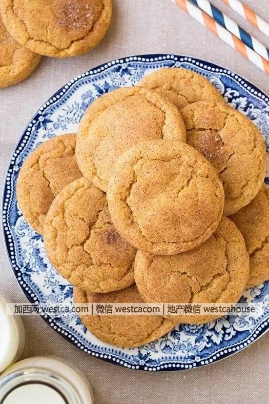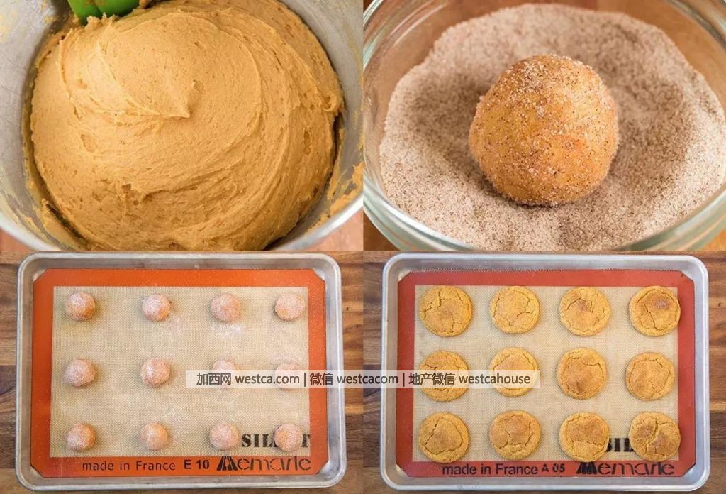 ③ 烤箱预热到180℃。在小碗中混合砂糖和肉桂粉,制成蘸面团用的粉。用汤勺取合适大小的面团,揉成小球,均匀沾满蘸粉,放入铺有油纸的烤盘中,压成饼状。