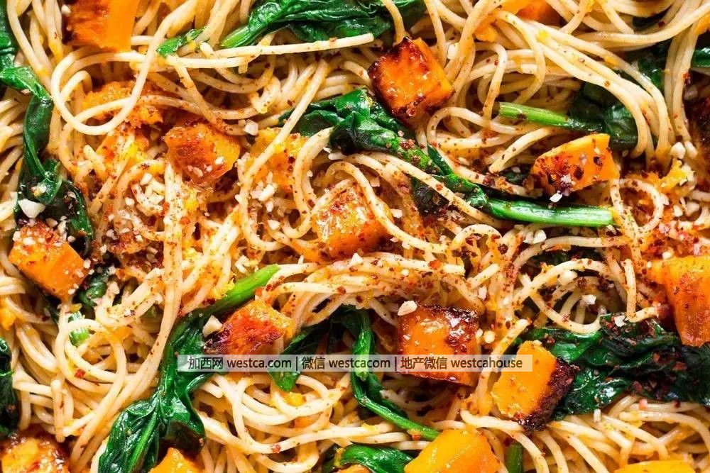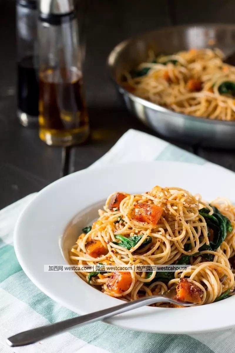 ③ 在平底锅中加30ml橄榄油,放入蒜蓉小火炒香,放入辣椒面继续炒1~2分钟。放入捣碎南瓜和整块南瓜,一起翻炒。随后将沥干意面和洗净的菠菜也放入锅中,和南瓜均匀混合,加胡椒、盐、柠檬汁调味。