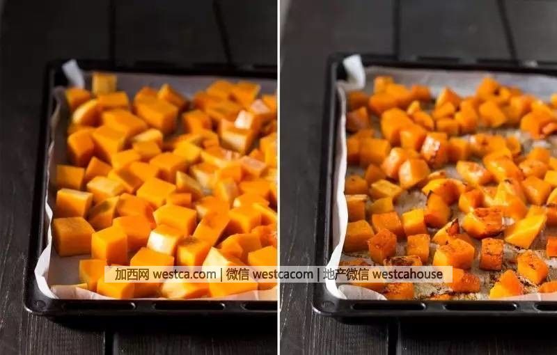 ① 将15ml橄榄油均匀涂在南瓜块表层,加盐调味。烤箱预热225℃,烤40~50分钟,至南瓜变软呈轻微焦糖色。把一半南瓜用叉子或搅拌器捣碎。