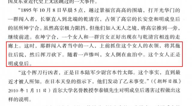 《朝鲜王朝的仪轨》中也认为,乙未之变是日本人组织的一次目的明确,关系重大的的政治刺杀,是庞大计划的一部分。执行行动的并非什么日本浪人,而是正统的日本军官特遣队,而他们不知道闵妃长什么样。当时的情况是,围住宫殿,然后甄别、杀死。