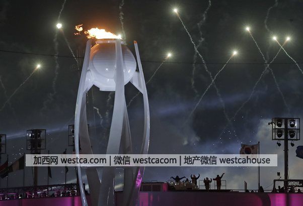 温哥华市中心Jack Poole广场昨晚举行仪式燃点二零一零冬奥火炬,以示支持在南韩平昌冬奥会参赛的运动员.