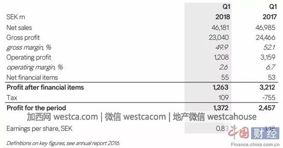 根据集团公布的2018财年第一季度财务数据,截至2月28日的三个月内,公司营业利润同比下跌62%至12.08亿瑞典克朗,约合人民币9.06亿元;净销售额(不含税)同比下跌1.7%至461.2亿瑞典克朗,约合人民币345.67亿元。