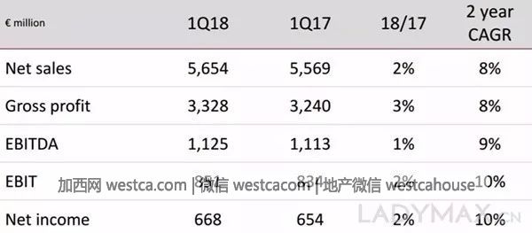 集团毛利润同样增长14%至32亿欧元,毛利率为58.2%,净利润则同比大涨18%至6.54亿欧元,是H&M集团第一季度净利润的两倍有余。?