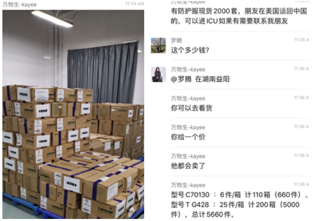 口罩賣回美國3月23日,微信公眾號“西雅圖雷尼爾”曬出一個“美國醫院物資對接”群組中的對話截圖,該對話一方說:“有防護服現貨2000套,朋友在美國運回中國的,可以進ICU如果有需要聯系我朋友。”配圖為成堆的包裝箱,上面貼著標簽“中國加油”。此截圖被海外華人廣泛轉發、評論。有網民憤怒地寫道:“有這麼不要臉的嗎?把國外捐贈給中國的保護服,原封不動再賣出國。捐的任何錢物,落不到普通百姓之手,反而被官員倒賣掉。”