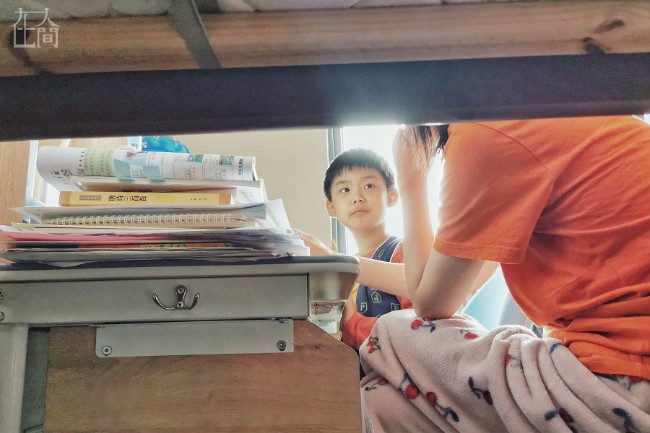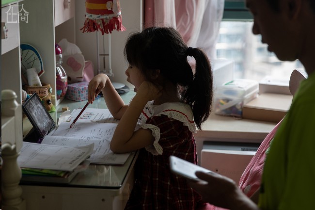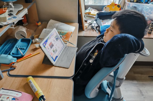 上网课的时候,年龄小的妹妹打起了呵欠。她上课有时还需要大人陪同。