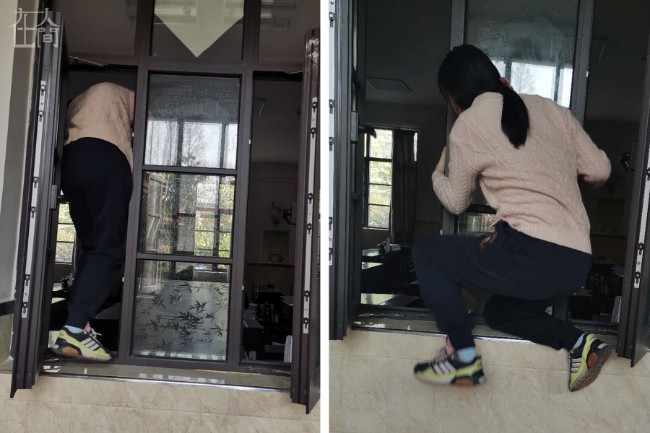 2月18日,儿子在家里靠墙蹲。疫情期间在家锻炼非常重要。