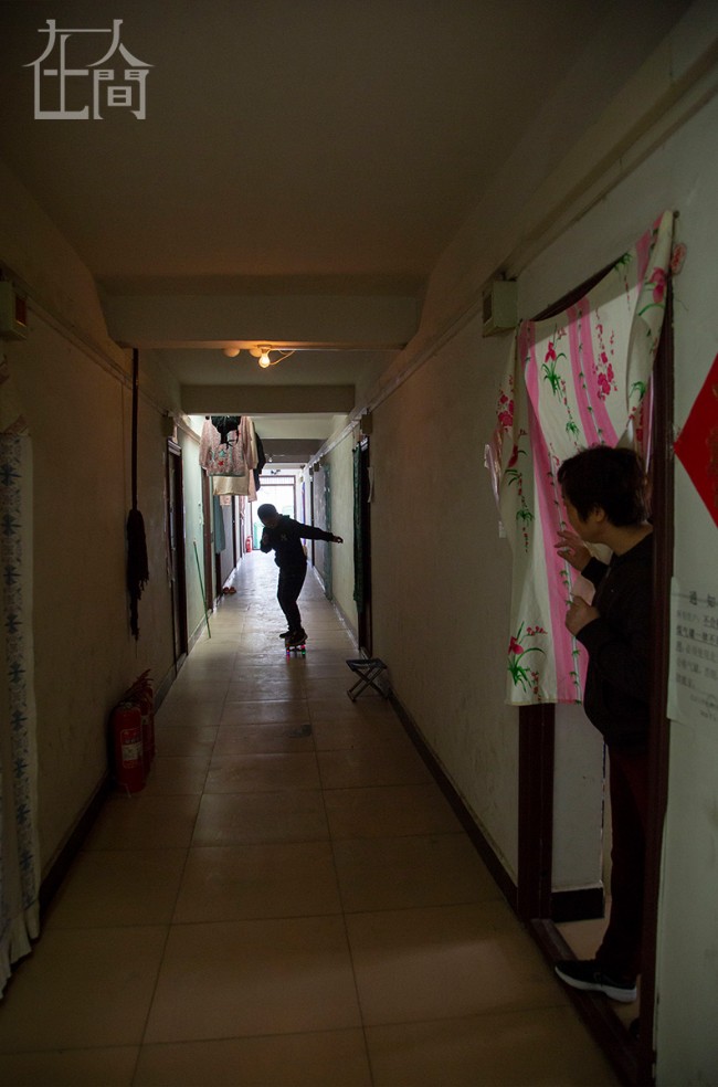 4月22日中午,天一做完作业后,在家门外的走廊上滑滑板。