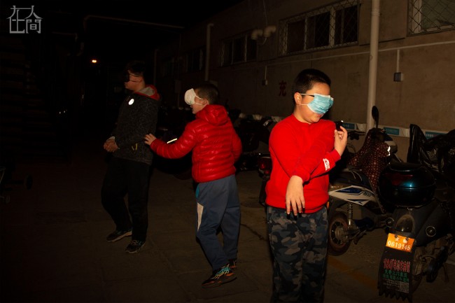 图为4月1日晚上,天一和小伙伴一起玩“盲人抓人”的游戏。天一用口罩遮住双眼,寻找小伙伴。