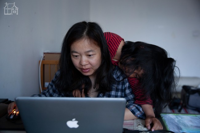 图为4月22日上午,天一在家里上网课,妈妈也在家里上班。天一爸爸在中关村开了“数据恢复”的店,天一妈妈在家帮着在网上发广告贴。