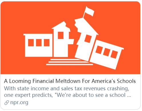 据美国全国公共广播电台(NPR)报道,学校从政府获得的财政资金下降了将近一半。美国预算与政策优先中心的负责人迈克尔?利奇曼(Michael Leachman)表示,在美国因新冠疫情而实施封锁政策的第一个完整月份(也即4月),各州的税收收入相较于去年同期下降了25%到33%,而各州平衡收支的措施中就包括了削减学校财政资金。