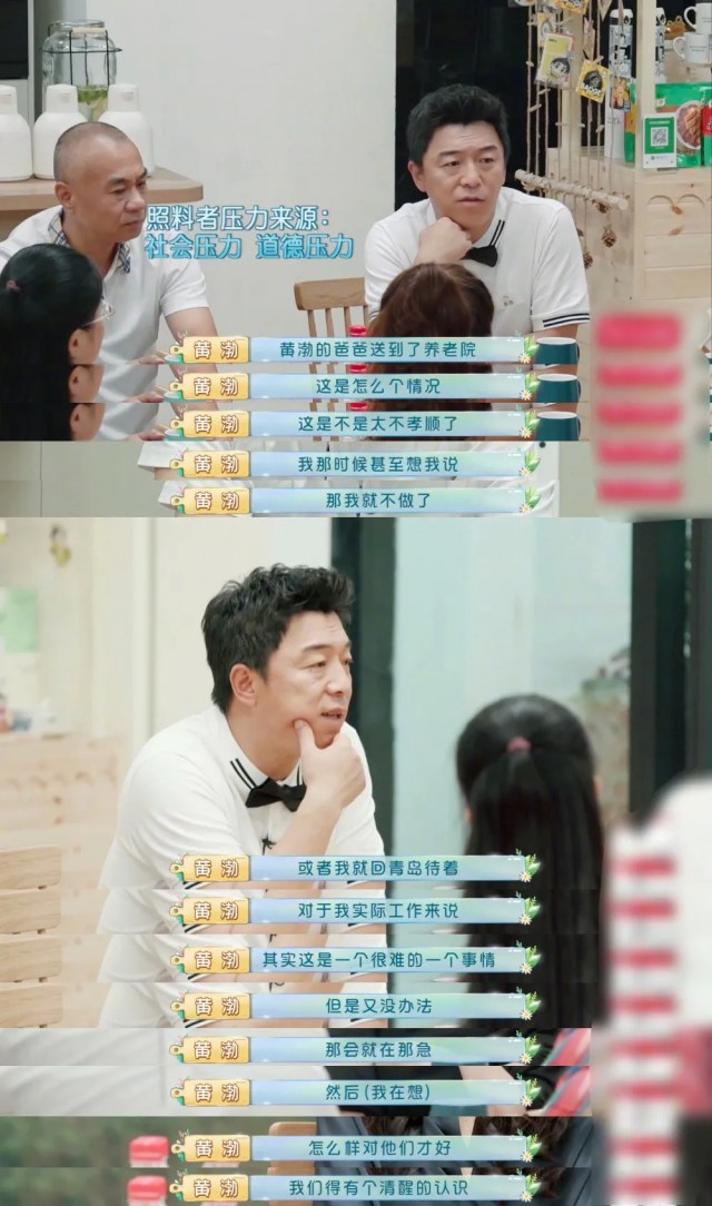 黄渤坦言自己背负着道德和社会压力,一度想过放弃职业生涯,回青岛专职照顾父亲,但从自己现处的人生阶段来看,这不现实。