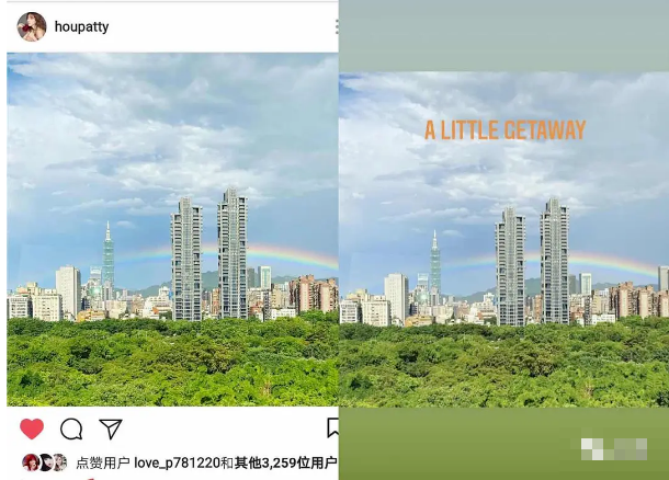 甚至她还加了几层滤镜,配了个文字,这幅彩虹天空图就成了“她旅途中的随手拍”了。