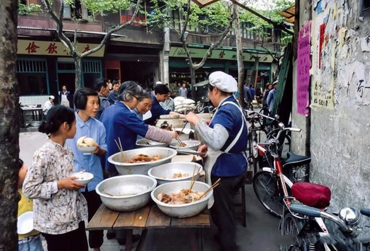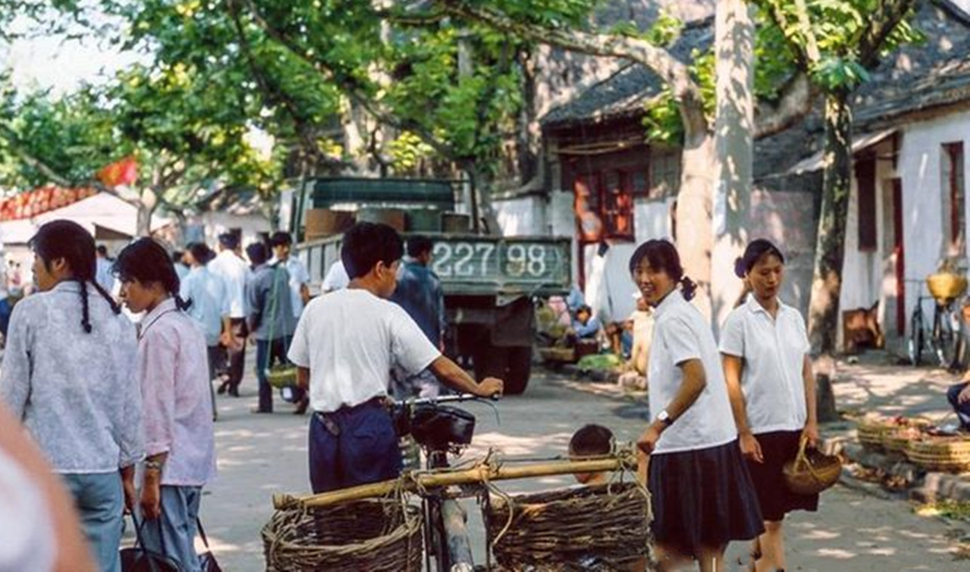 1980年代的杭州街头,一个孩子坐在父亲用自行车驮着的篮筐里,母亲在一边扶着保持住平衡。那时的孩子好多坐过这样的车子的。