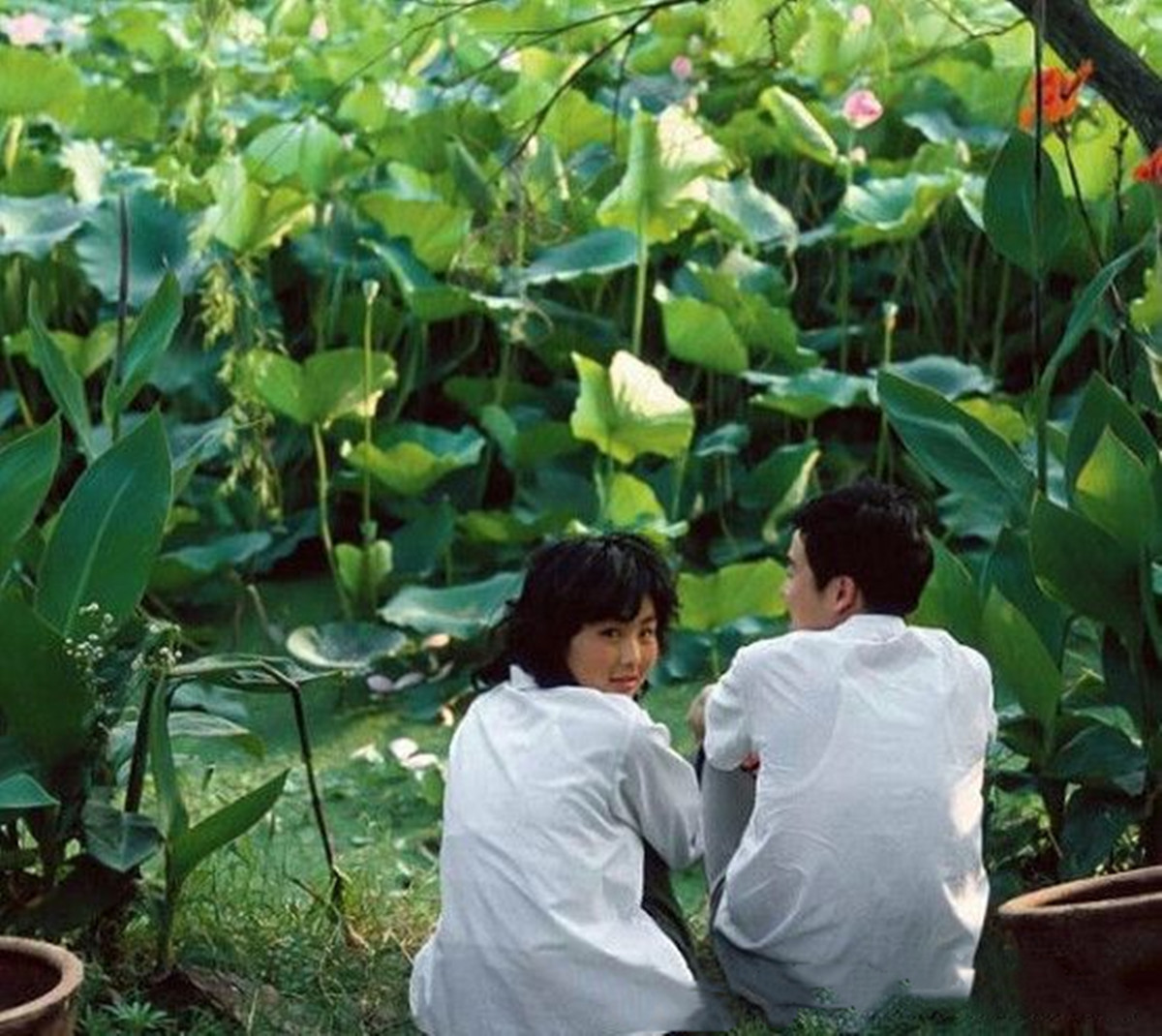 1980年代的西湖湖边,碧绿的荷叶遮掩下,一对情侣正在卿卿我我。漂亮的姑娘回头的一瞬间被摄影师捕捉到了。