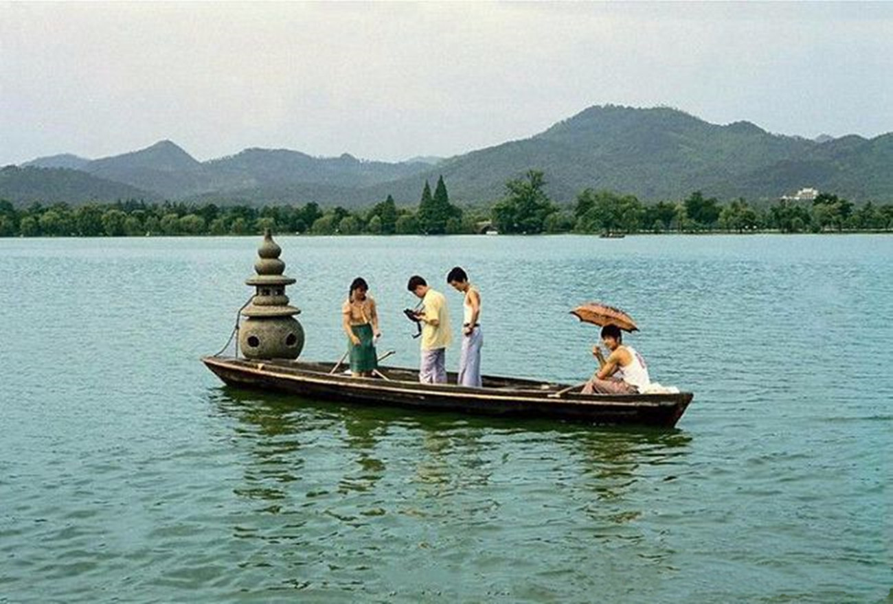 西湖,杭州城的灵魂。杭州因为西湖而知名,图为1980年代的西湖,碧波荡漾,风景秀丽,美丽如画。那时西湖的游人稀少,只有几个游客正在泛舟西湖。