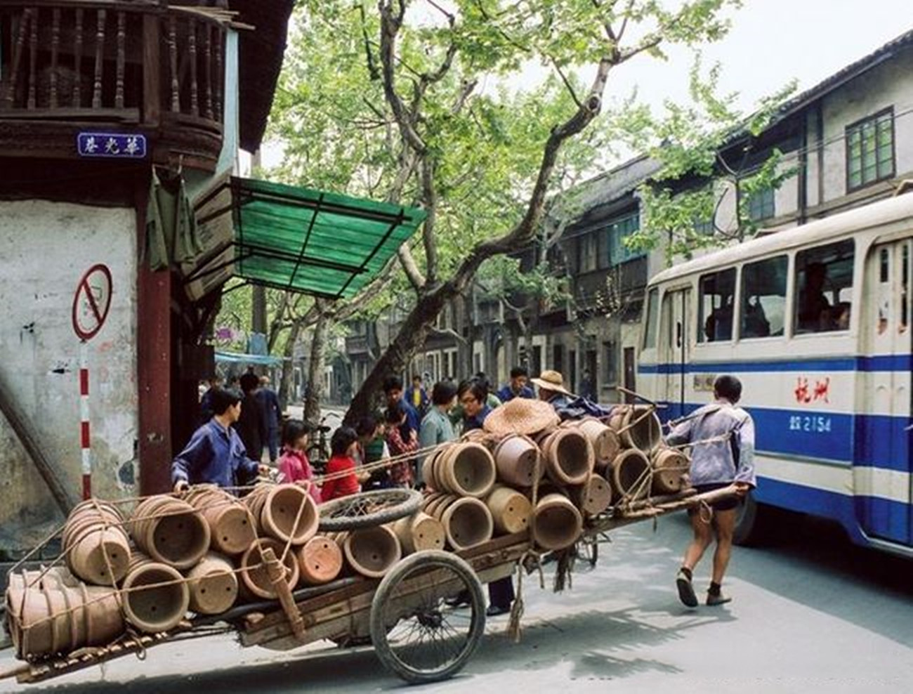 1980年代的杭州街头,一个男人拉着一辆载满陶器的平板车在街市上走过。