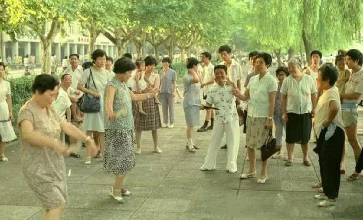 1980年代的杭州西湖湖边,一群大妈随时随地都可以翩翩起舞。杭州秀丽的风景,催生出了市民们惬意的生活。