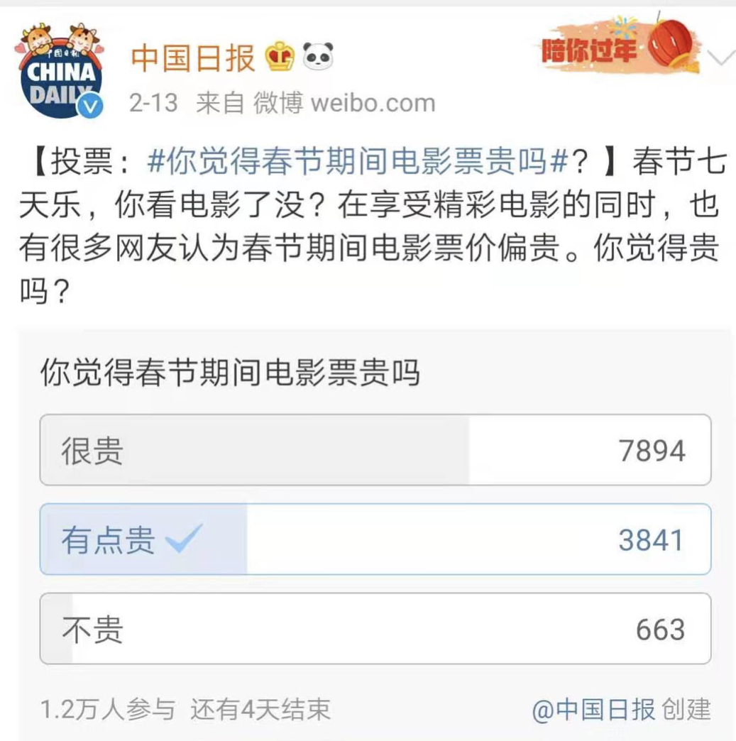 但也有網友反映,春節電影票太貴,“勸退”了自己。在@中國日報發起的網絡投票中,65%的網友覺得春節電影票貴了。