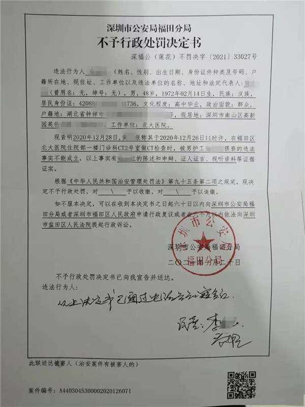 根據黃女士提供的2021年1月20日的《深圳市公安局福田分局不予行政處罰決定書》顯示,“現查明2020年12月28日,黃某報稱其於2020年12月26日上午11時許,在福田區北大醫院住院部一樓門診科CT12號室做CT檢查時,被男護工寇某紅猥褻的違法事實不能成立,以上事實有寇某紅的陳述和申辯、證人證言、視聽資料等證據證實。根據《中華人民共和國治安管理處罰法》第九十五條第二項之規定,現決定不予行政處罰……”