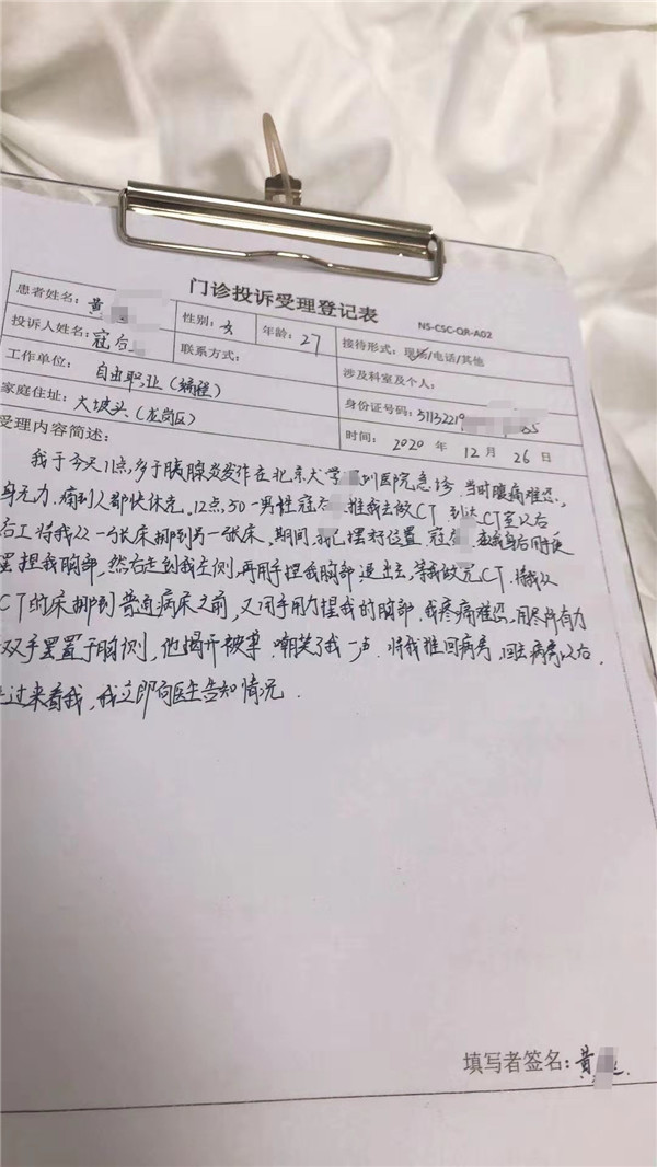 2月25日,四川女孩黃女士反映,2020年12月26日上午10時,她因急性胰腺炎發作,打車到了北京大學深圳醫院求醫。因其病情嚴重,當她下車來到該院急診室時,她的肚子疼得處於精神崩潰狀態,就直接就倒在了護士的工作台旁。隨後,她被人扶上了一張病床,在11時55分左右時,醫生讓一名50歲左右的男護工推著她去做CT檢查。
