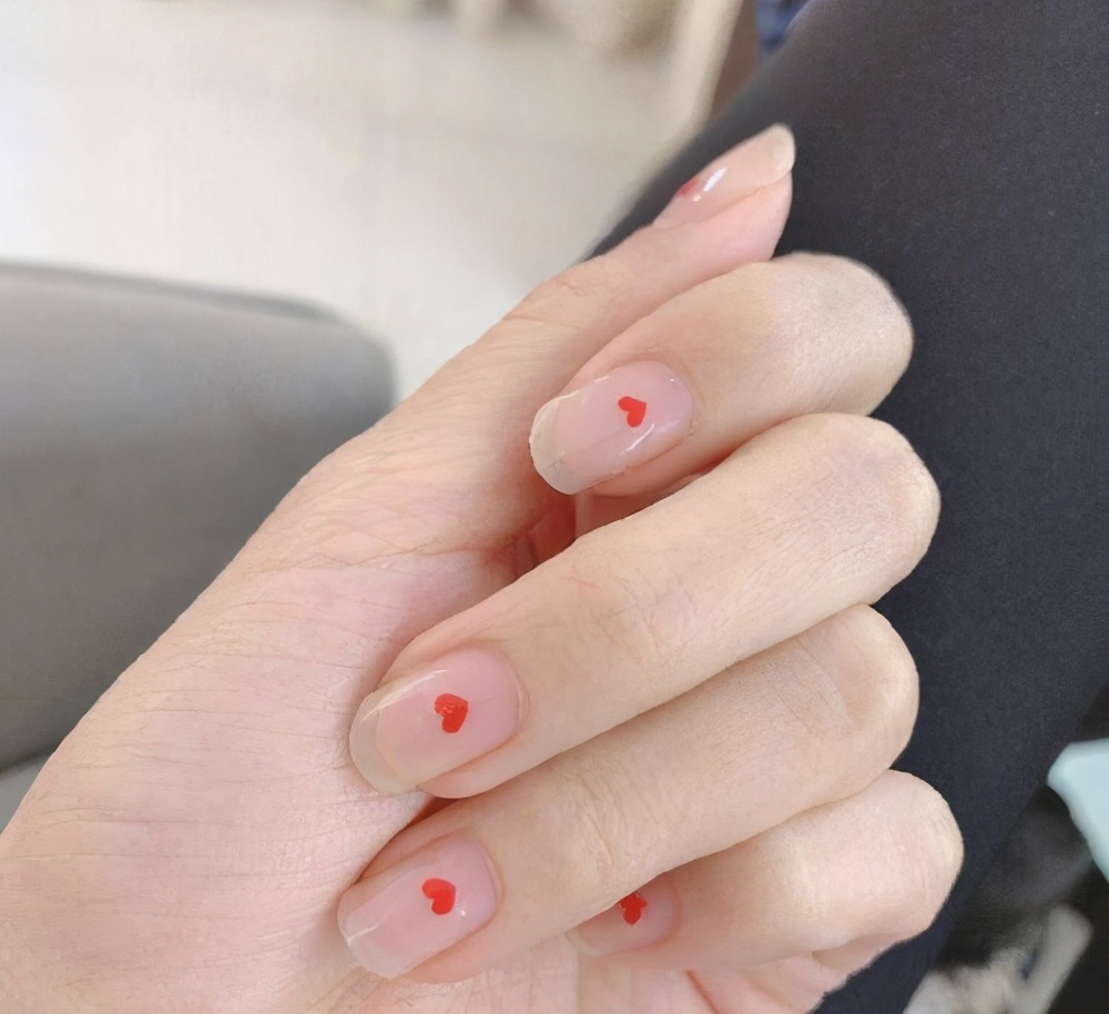 这款小红心美甲的制作非常简单,在透明的妆底上只有一颗小红心作点缀,但这种朴素而可爱的风格却意外地受欢迎,在社交软件上引起一阵美甲潮流。这款美甲还有一处比较特别的就是随着指甲的增长,爱心会从指甲根部的位置不断上移,实现持久而不单调的效果。
