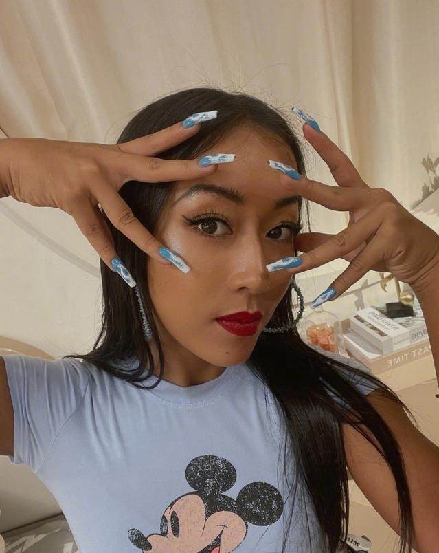 图中吉克隽逸的指甲造型如之前一样,做出了长指甲的效果,选用了蓝色与白色,简单又精致,与衣服和妆容相搭配,活泼又不失个性。