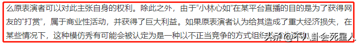 另外,因为“小林心如”直播的目的是为了让网友打赏赚钱。如果原表演者认为这样的行为给他造成了经济损失,那么这样的模仿秀则可能会被认为是一种以不正当竞争的方式阻止的商业活动。