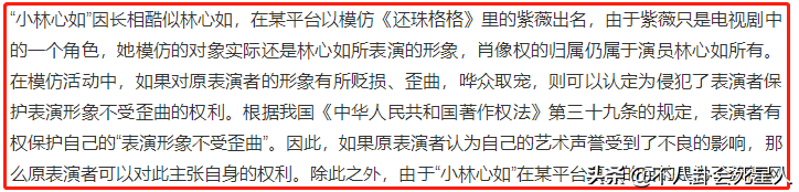 小林心如的火爆是显而易见的,但是这其中存在的隐患也呼之欲出。近日,就有媒体称小林心如模仿林心如的行为涉嫌侵权。