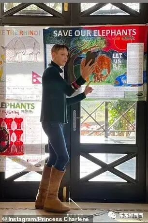 但依然是一枚強悍的王妃,一邊通話一邊跟娃指點牆上的保護野生動物海報,介紹不遠就是犀牛孤兒收養所,她會幫忙制作用具↓↓