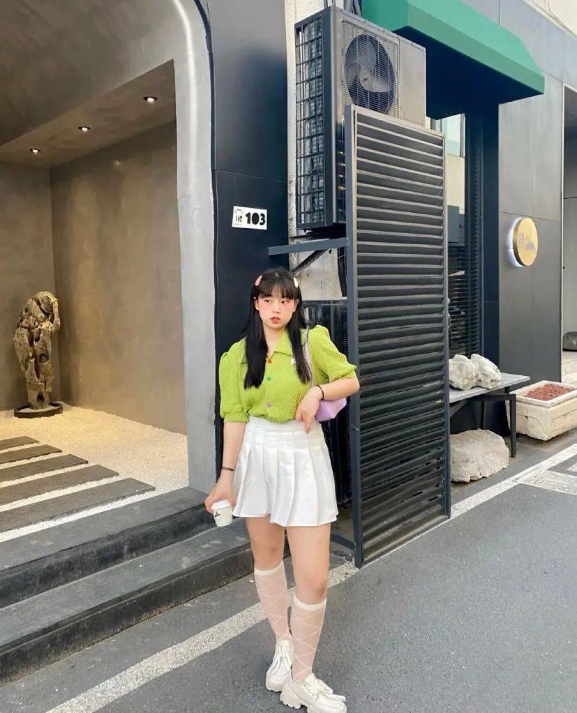 如果是因为苹果型身材而显得腰粗的姐妹,那泡泡袖短上衣+百褶裙的组合你们一定要尝试。