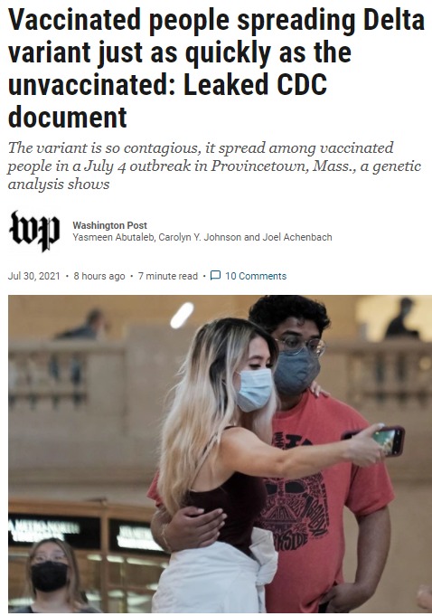 根据华盛顿邮报的报道,这是一份来自美国疾病控制和预防中心的内部文件,反映了美国最高公共卫生机构在说服公众接受疫苗接种后仍然需要努力做好预防措施(包括戴口罩),因为美国各地的病例激增,而且新的研究表明接种疫苗的人也可以传播病毒。
