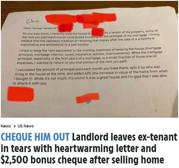 几天之后,Robarge 收到了这位前房东的来信,信中提到他曾经租住的这个房子已经卖掉了。房东表示自己很开心,因为房子卖了一个不错的价格。