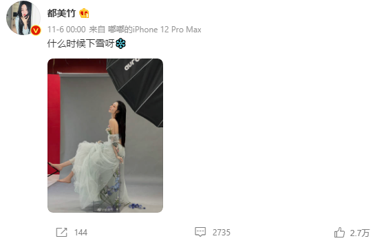 她在微博上发了一张美照,配文“什么时候下雪呀”,特殊的时间点让有些网友觉得她的文字别有深意,也有的网友质疑她在蹭热度。