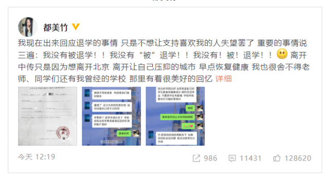 都美竹强调自己没有"被"退学”,是自己自愿的。早在9月就申请退学离开,原因是很想离开北京,离开让自己压抑的城市,早点恢复健康