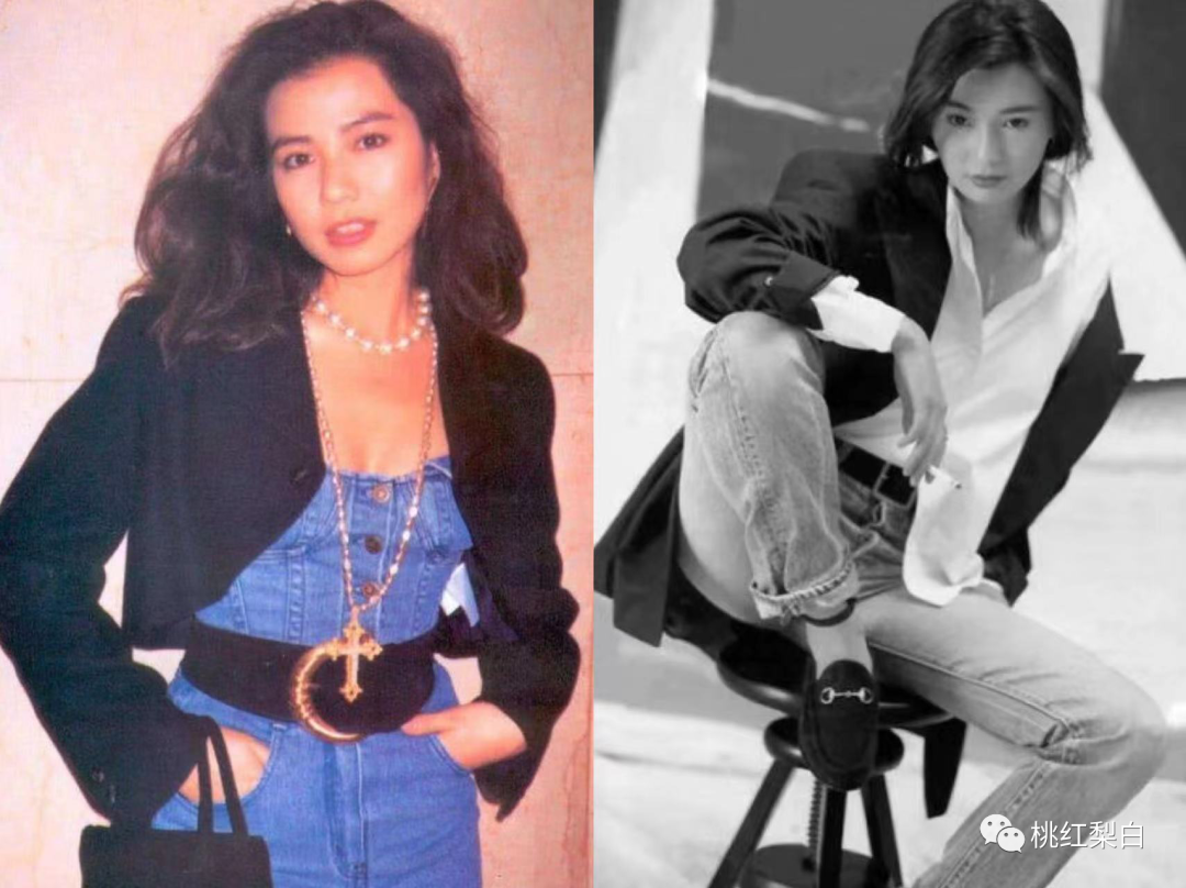 不管是當時流行的牛仔單寧外套,還是皮衣或者大墊肩西裝,尺寸上一定要把握“大”和“松”這兩個特點。 整個人被罩在這種大外套裡,首先從第一眼視覺上看,個人氣場就會有所增持,為許多即便身型嬌小的女士,也在外形上增加了不少氣勢。張曼玉鍾楚紅就是那個時期的代表。